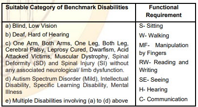 4% horizontal reservation has been provided to Persons with Benchmark Disabilities as per section 34 of “The Rights of Persons with Disabilities Act (RPWD), 2016”. The post is identified suitable for the Persons with undernoted categories of disabilities as defined in the Schedule of RPWD Act 2016: