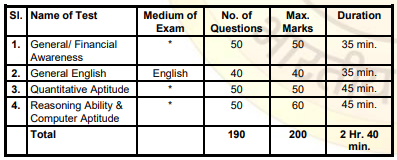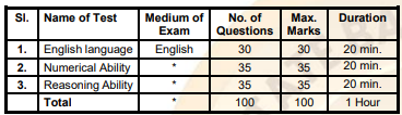 Phase-I: Preliminary Examination: Online Preliminary Exam consisting of Objective Tests for 100 marks will be conducted online. This test would be of 1-hour duration consisting of 3 Sections as follows: